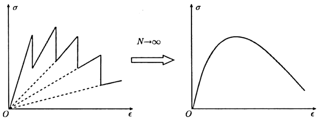 为了更清晰表达混凝土损伤模型示意,可从上图看,在外力小于某一值时,微弹簧系统不发生断裂,相应的应力-应变关系具有线性变化特征。当外部拉力增加,使得具有最小断裂应变的微弹簧的应变达到其断裂界限值时,该微弹簧断裂,其释放的应力由其他微弹簧承担(应力重分布),与此同时,系统整体刚度降低,导致微弹簧系统的应力-应变关系进入非线性变化阶段。随着外部拉力的增加,微弹簧断裂的数量不断增加,应力-应变曲线的非线性愈加显著,表现为应力的增加速率明显小于应变的增加速率。当在一个增量步内,未损伤部分的应力增加量小于因损伤导致的应力降低量时,即微弹簧断裂造成的平均应力降低大于因外力增加导致的平均应力增长时,应力一应变关系进入下降段。应力一应变上升段与下降段的交点,即为微弹簧系统所代表的细观单元的受拉极限强度。由于各个微弹簧的断裂应变具有随机分布特征,无论是初始损伤的发生时刻,还是后续的应力重分布过程,都将具有典型的随机性特征。因此这不仅解释了损伤导致非线性的物理本质,也同时描述了受拉损伤的随机演化进程。