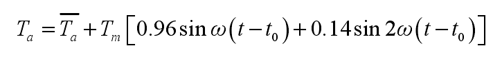路基的温度场 边界 比较复杂,本文采用第二类和第三类边界条件,考虑太阳辐射、对流换热和地面有效辐射的影响。太阳辐射主要影响大气温度变化,这里采用下式描述大气温度变化