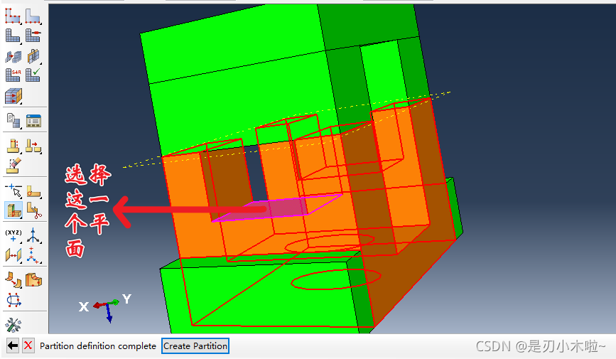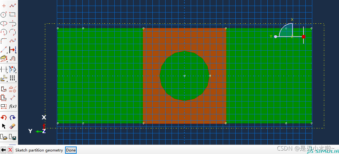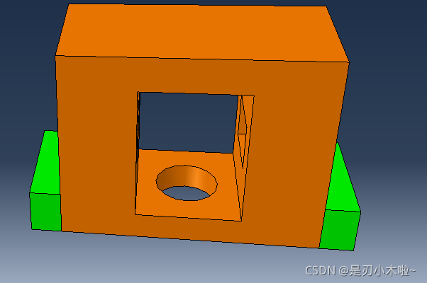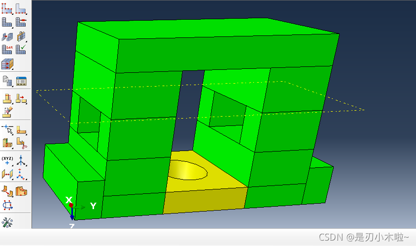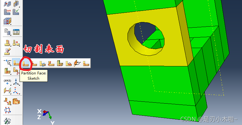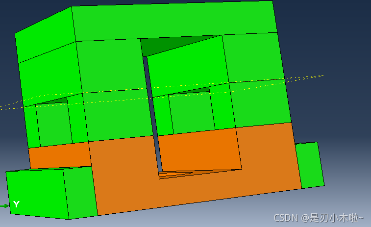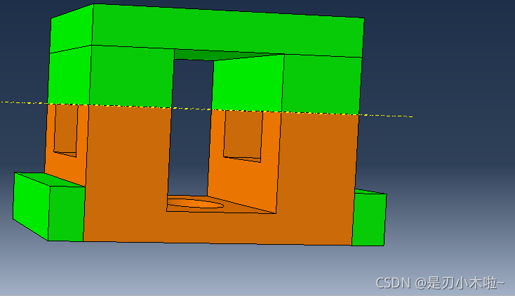 现在底部是黄色的,说明这部分可以通过扫掠的方式进行划分。 但是中间有个圆孔,扫掠不是很合适。可以再进行切割: