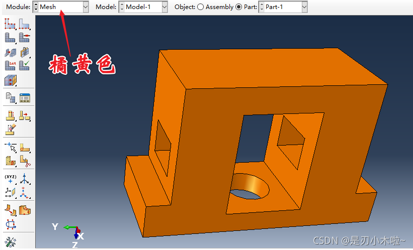 进入mesh中,整个几何体变成了橘黄色,橘黄色的意思是当前无法直接进行网格自动化分。针对这次较为规则的模型,最好的方案还是进行模型切割。