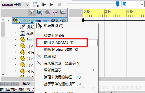 配合好以后,进行motion仿真,不需要添加任何的 驱动 ,直接点击计算。一般motion没有默认打开,因此可能需要手动打开。在运动算例中切换到motion,设置一个计算时间(不然不能计算),点击计算,SolidWorks就会进行仿真。SolidWorks的仿真结束以后,在运动算例里面可以查看自由度,可以选择去除无用的约束。在运动算例里,右键装配体,可以选择导出到Adams,就可以生成一个.adm文件
