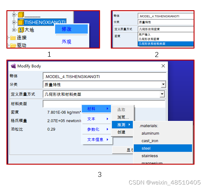 A: 可能 SW 中自定义材料属性没有被ADAMS识别,需要在AD重新设置材料属性。选择合适的材料即可。当从SolidWorks(SW)将模型导入至ADAMS时,若发现模型虽显示具有质量参数,却缺失关键的质心坐标信息,这往往源于SW中为模型或其组件所定义的自定义材料属性未能被ADAMS软件准确读取与识别。这种情况下,ADAMS无法依据这些未被识别的材料数据自动计算出精确的质心位置。为解决此问题,用户需在ADAMS环境中手动重新配置模型的材料属性。通过ADAMS内置的材料库,选择与原模型材料特性相匹配的标准材料,或根据具体需求输入详细的材料密度、弹性模量等参数。这一过程不仅确保了材料属性的正确传递,更能让ADAMS基于这些标准或自定义材料数据,精准计算并赋予模型完整的质心坐标,从而保证后续动力学仿真分析的准确性与可靠性。