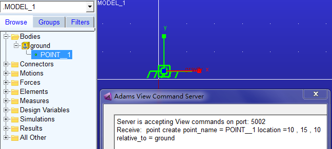 print response# Returns: cmd: 0 (on success) cmd: 1 (error detected in View command)cmd指令在相对于ground的(10, 15, 10)位置处创建了一个点,命名为POINT_1: