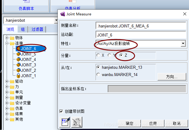 (2)修改“测量名称”,以便在后处理中选择,特性选择“Ax/Ay/Az投影旋转”,分量选择“Z”方向,点击“确定”。