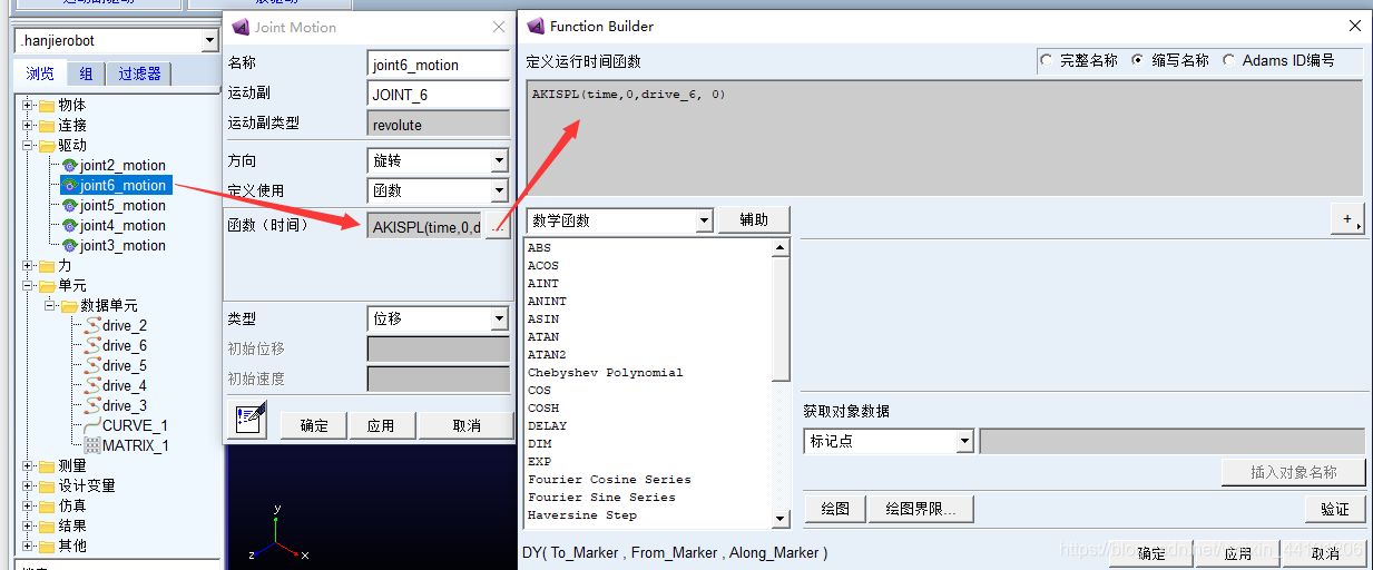 5、点击在相应关节施加的“旋转驱动”,鼠标右键,点击“修改”,打开“函数(时间)”,在文本框中输入“AKISPL(time, 0, drive_6, 0)”,其中drive_6为刚刚生成的相应关节的样条曲线数据的名称。