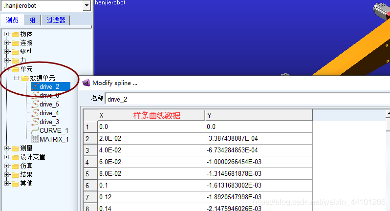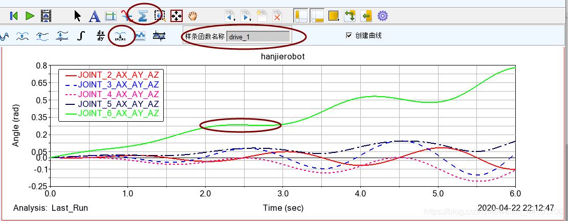 在上节讲到利用在末端执行器施加Marke点驱动以及施加空间螺旋曲线进行轨迹规划仿真,本节讲述如何得到各关节的运动输入曲线,利用Spline工具对曲线采集数据样点,作为各关节驱动的的输入参数。