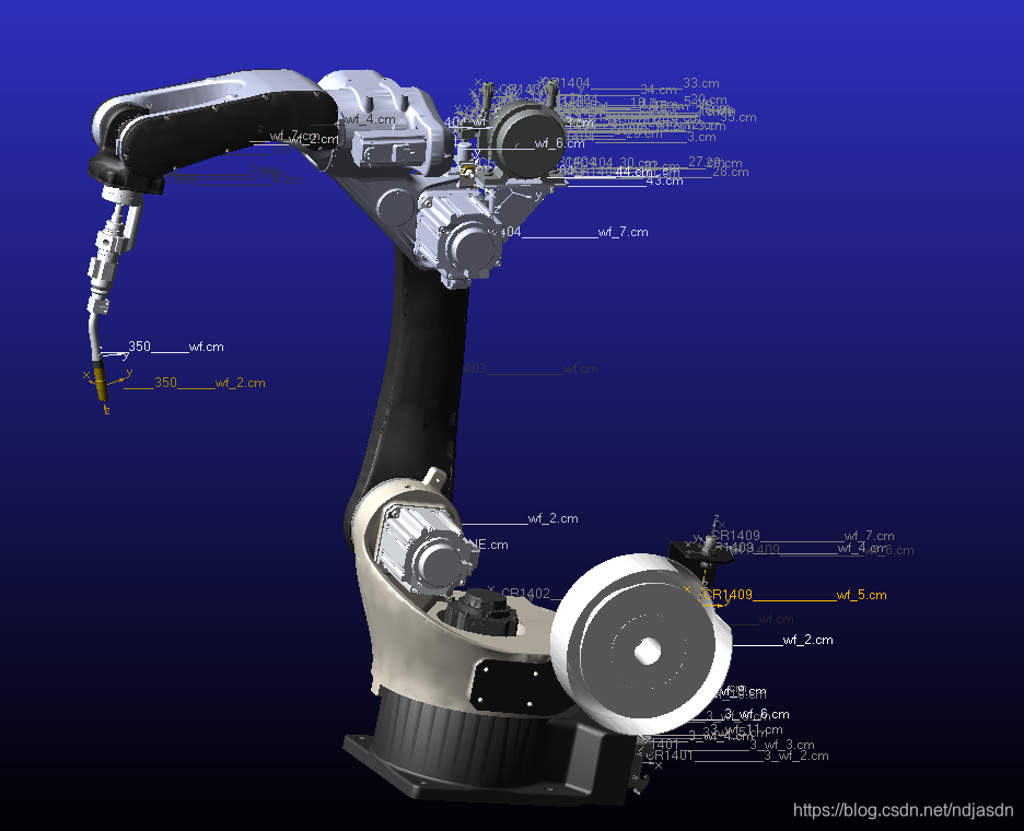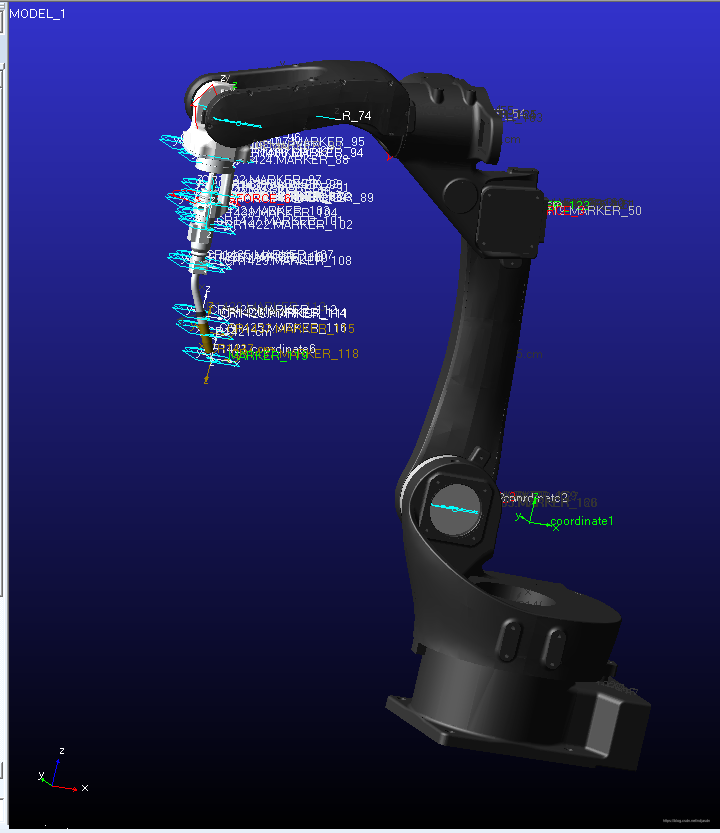 Solidworks另存为.xmt_ txt格式 ,adams导入此文件,导入的时候坐标系选择局部坐标系,导入的机械臂模型如下