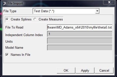 2、在view界面下,file-import,file type选test data,并选create splines,在file to read 中选到自己所要导入的文件,independent column index 输入自变量所在列,我一般都是在导出时将时间数据放第一列,测量数据放第二列,因此这里自变量所在列为1。