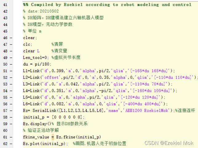根据上述的DH矩阵参数,根据DH建模的选取原则设计如下的基于RVC程序。