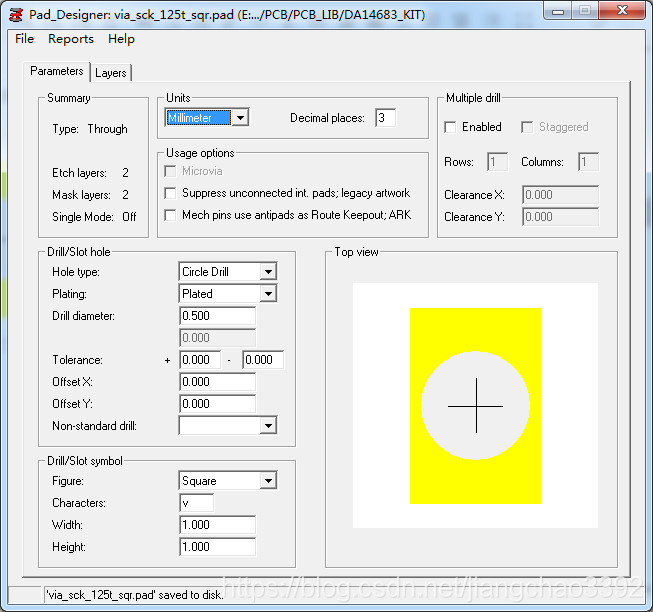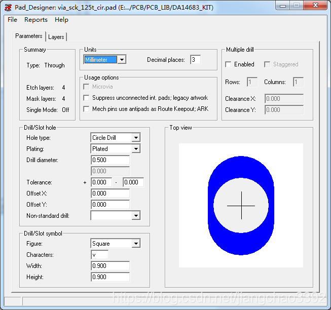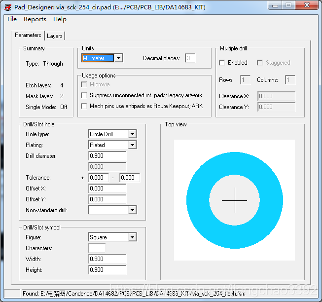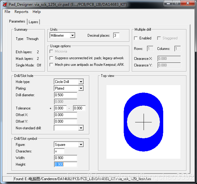 Non-Plated :非金属化的。一般的通孔元件的管脚焊盘要选择金属化的,而元件安装孔或者定位孔则选择非金属化的。在Drill diameter 编辑框中输入钻孔的直径。
