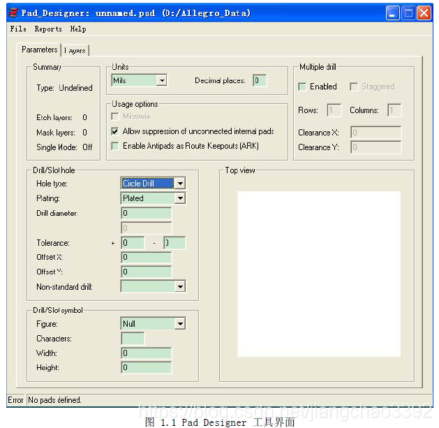 打开程序->Cadence SPB 16.2->PCB Editor utilities->Pad Designer,弹出焊盘制作的界面,如图 1.1 所示。