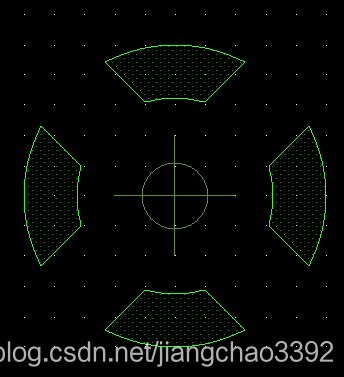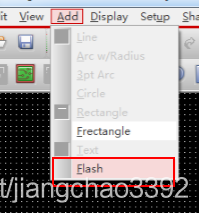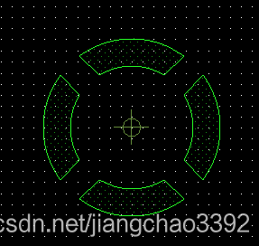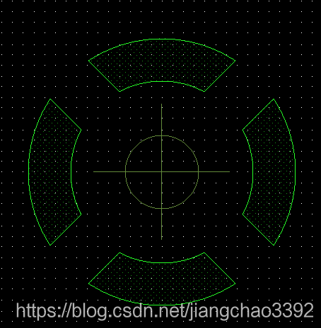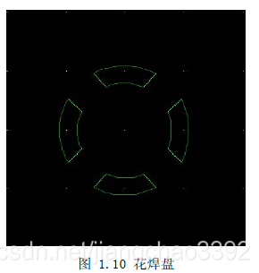 至此一个圆形热风焊盘就制作完成了,如果要生成其它形状的焊盘,如椭圆形,方形等,就不能用Add->Flash 来生成,需要用Shape 菜单下面的画矩形画圆等工具来画。自己先画一个草图,并将每个点的坐标计算出来,然后使用画矩形9画圆等命令并通过在命令状态栏那里输入坐标来画。需要注意的是由于热风焊盘是在负片中使用的,你画出的形状看得到的地方(图 1.10 绿线围起的区域)实际上做出PCB 来后是被腐蚀掉的,黑色(底色)的才是真正有铜的地方。