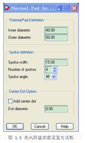 在Inner diameter 编辑框输入内径40,Outer diameter 编辑框输入外径50,Spoke width 编辑框输入连接口的宽度15,最好不要小于板子的最小线宽。在Number of spokes 选择开口的数量,默认4 就可,Spoke angel 输入开口的角度使用默认的45 度就可。其它默认,点击OK 后就会自动生成一个花焊盘形状,如图 1.10 所示。