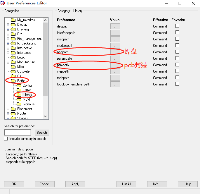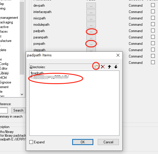 2.设置库的路径,在padpath、psmpath后面选择准备好的PCB和焊盘路径,即第一步 中文 件夹A的位置。