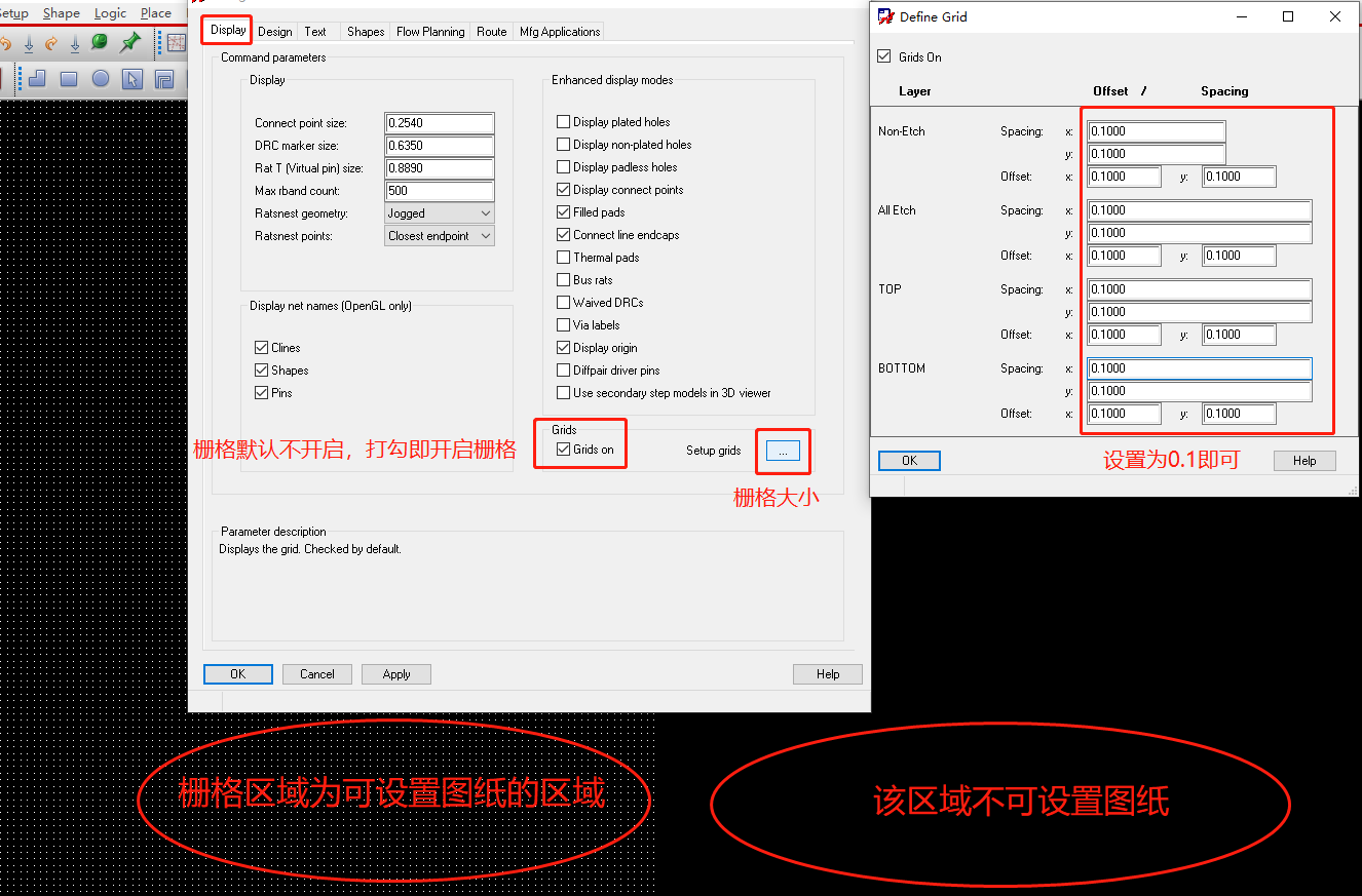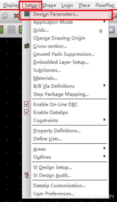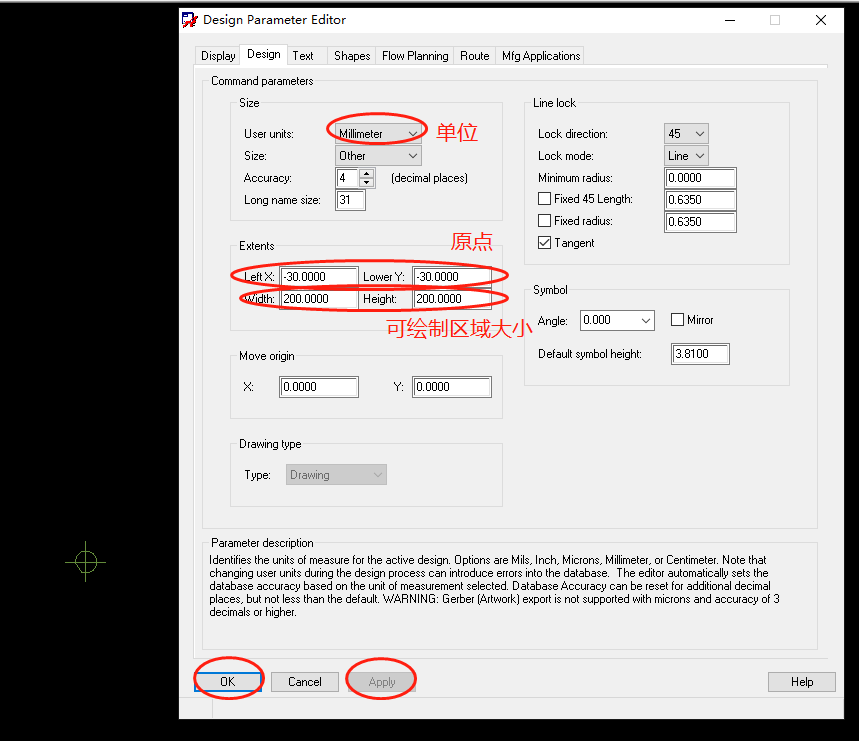 点击Setup-Design Parameters…,然后在Design Parameter Editor 中选择Design,默认的尺寸为mil,修改为mm,然后将原点位置改为-30,-30;可操作的图纸面积改为200*200,然后点击应用即可。