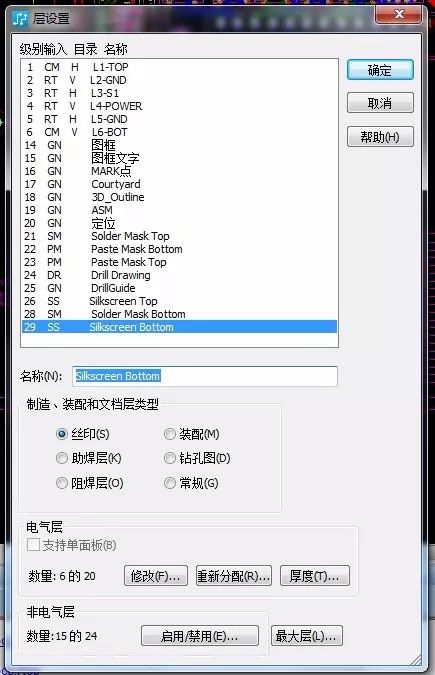 Silkscreen Top是第26层;Silkscreen Bottom是在第29层,Solder Mask Top是在第21层,Solder Mask Bottom 是在第28层,然后在相应的对象类型里面给他指定对应关系。