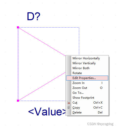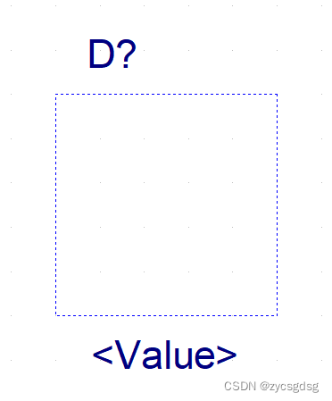 1处这里填我们的元器件名字,你可以随便写一个方面记忆的字母数字组合。2处是填位号的地方,(位号就是一个类名,如果把元器件比喻为水果,那么位号就是水果的颜色,比如各种原理图中各种芯片就可以用U来表示,二极管之类的可以用D表示),其他的选项保持默认不变。接下来映入眼帘的就是下面这个界面,虚线框就是规定器件的范围,你最后画的器件要在这个虚线框里面,这个范围可以拖拉更改(上面的D和Value可以先不用管)。