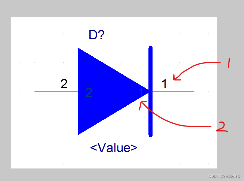 在Fill Style 里面选择solid可以把三角形填充成实心。然后画出二极管上面的一条线,最后画出两边的引脚,要注意区分直线和引脚的区别(直线是没有电气属性的,而引脚是有电气属性的),这里圈起来的部分就是 引脚 。