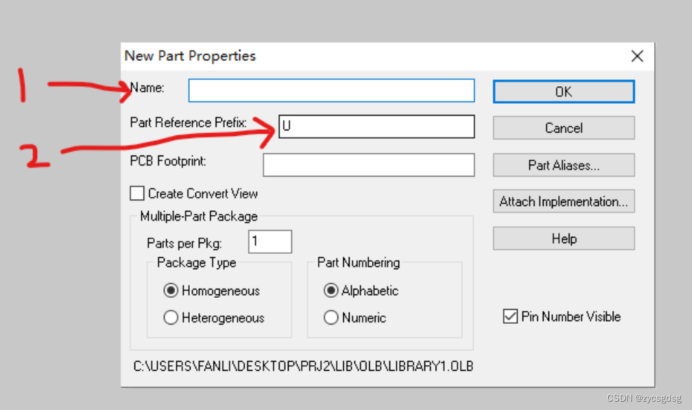 这个OLB文件和刚才的DSN文件都是一个合集文件的名称,OLB文件里面包含许多元器件,现在我们看到的是一个没有,这时候我们可以创建一个最基本的二极管。右击OLB选择NEW PART,然后会跳出来一个窗口,让你对你将要画的元器件的属性进行最基本的设置。