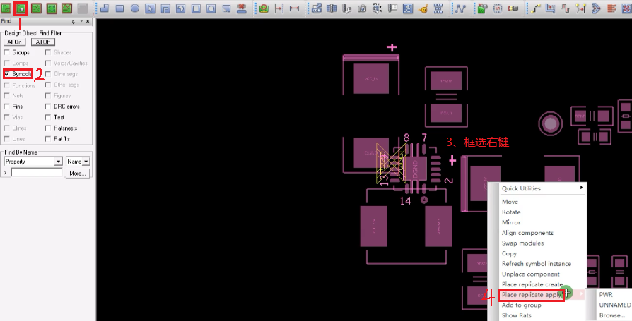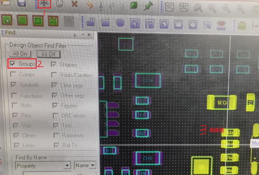 移动时Find面板选择“Groups”,这样就可以对此部分电路做右键“Mirror、Rotate”等操作。