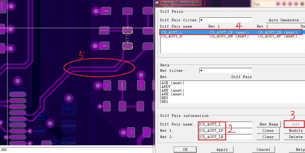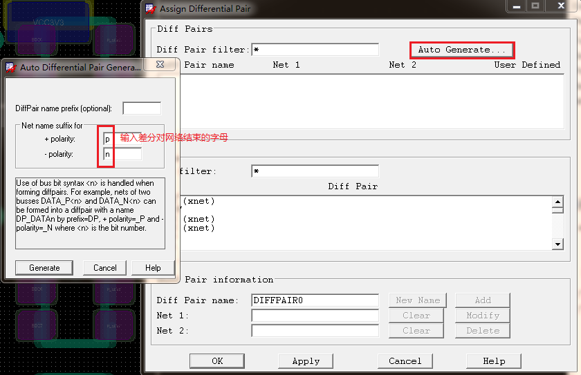 Logic/Assign Differential Pair…中点击需要添加的差分对的焊盘即可。