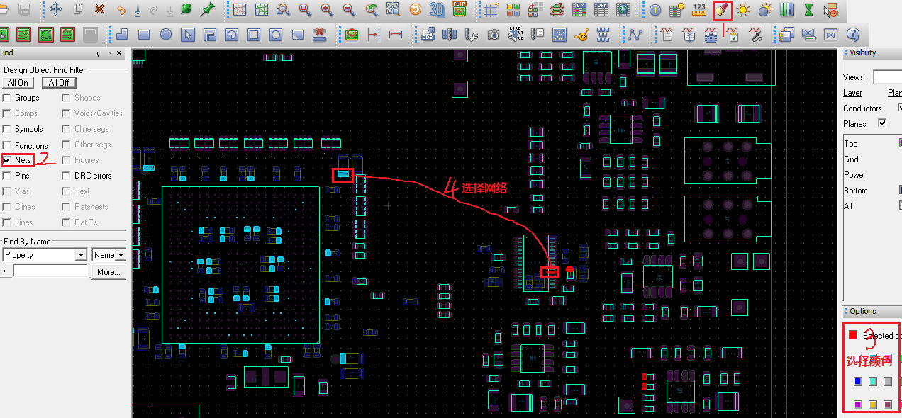 1)点击Assign Color命令,可以高亮元件Symbols、网络Nets