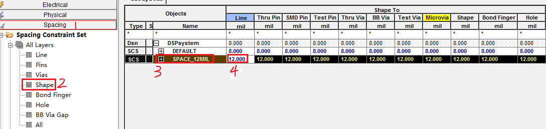 2)线距规则设置(Spacing Constaint Set)