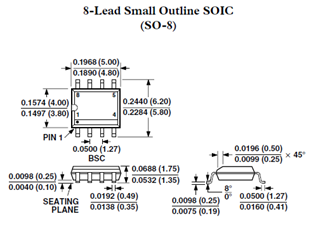 表贴IC是目前电子 系统设计 过程中使用最为广泛地,本文以集成运放AD8510的SO8为例来进行叙述。其尺寸图如下所示。