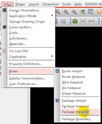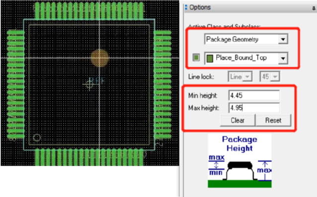 Setup ->Areas->Package Height,选中封装,在options中自动弹出Place_Bound_Top,并设置高度的最小和最大值