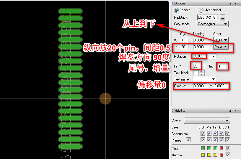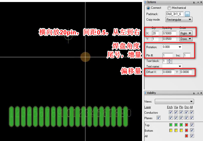3.放置焊盘,一次性放置20个pin,依次放4次,就放置了80个焊盘