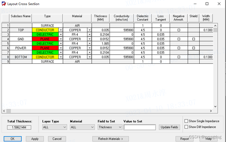 这里可以看到,两个黄色的层是顶层和底层的铜层,它的厚度是1盎司(可以查一下1盎司对应的公制是多厚),两个红色的层是中间的地和电源层,厚度是0.5盎司。这就是四层板常见的层叠设置,小白可以先抄答案。
