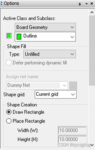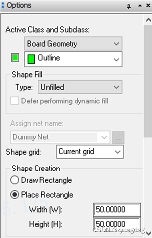 这里点击draw rectangle 是自己绘制,点击place rectangle是设置好板框大小然后直接放置。如果是绘制一个规则的板框,用直接放置的方式比较合适,我这里放置的是一个50mmx50mm的正方形框(如右图所示)。