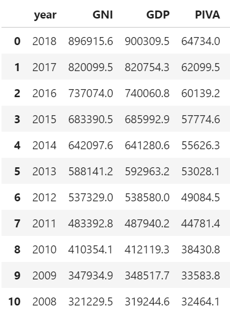 DataFrame 按照表格的方式来组织数据,最左边的0, 1, 2, 3, …表示行号,最上面的year, GNI, GDP, PIVA则是列名。每行代表一条记录,每条记录包括四个属性(从左往右依次为:年份,国民总收入,国内生产总值,第一产业增值)。请大家记住这个表格的大概格式,接下来折线图的绘制将与此息息相关。