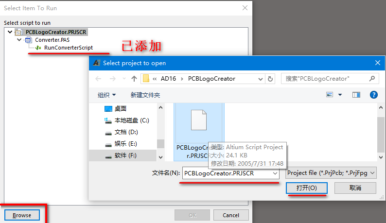 点击Browse,进入脚本所在文件,选择脚本PCBLogoCreator.PRJSCR,点击运行RunConverterScript