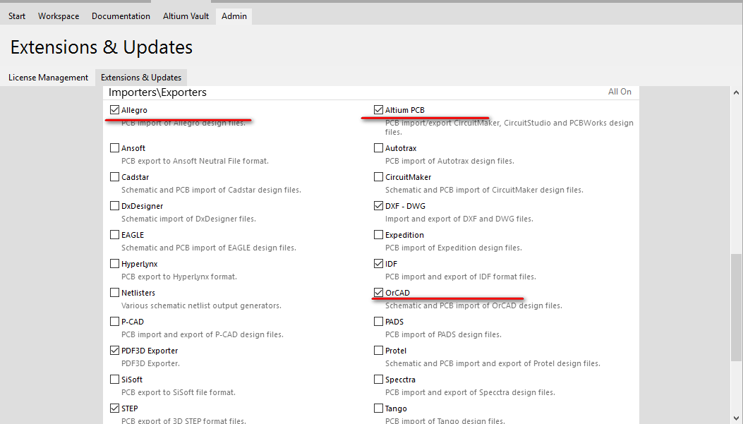 设置Importers\Exporters,Allerro、Altium PCB、OrCAD前面打对勾,然后选择最上面的 Apply