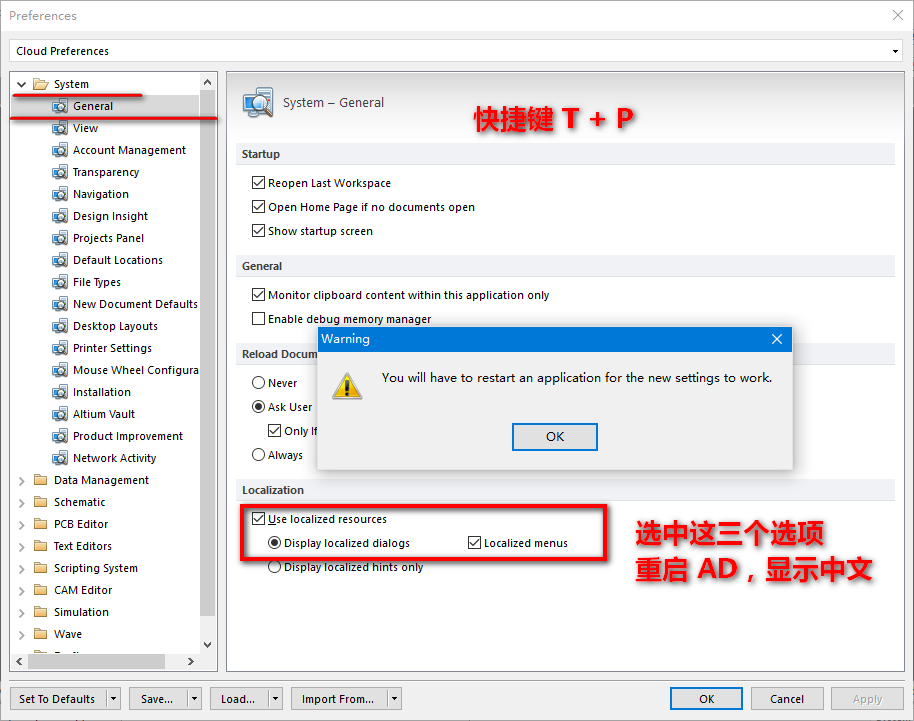 DXP->> Preferences->>System->>General->>如下图选中三个选项,点击 Apply ,重启AD,显示中文。