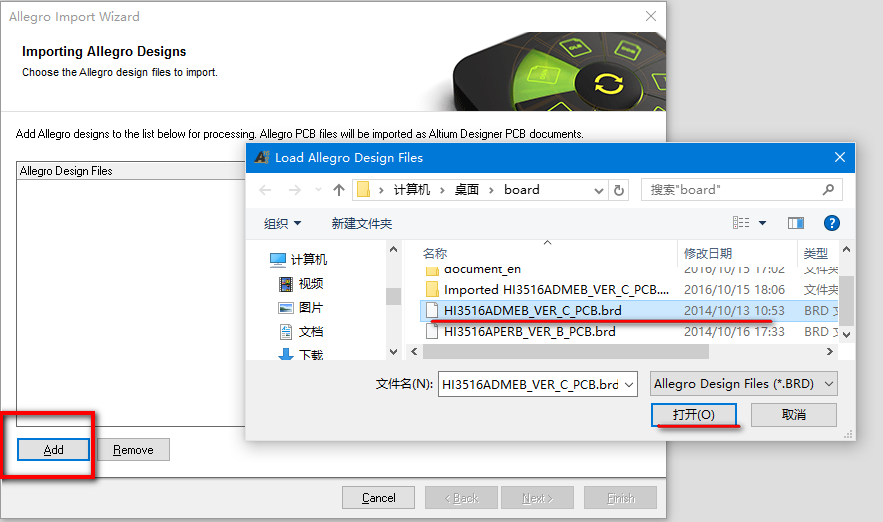 然后点击Add,选择要导入的XXX.brd文件,之后一直点击Next即可。