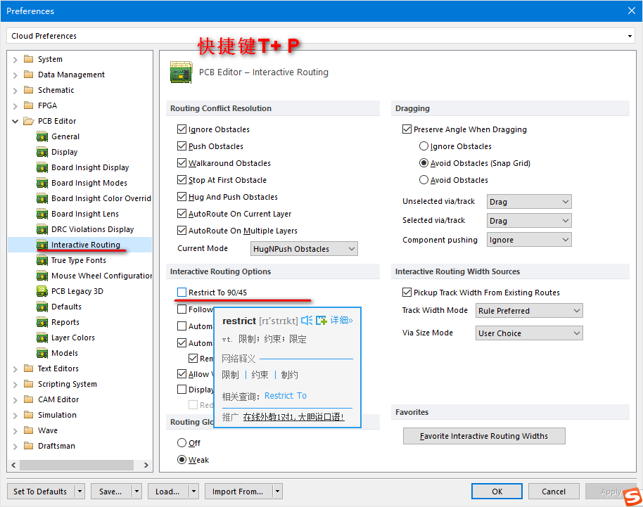 当切换布线模式的时候,可能可能遇到无法画弧线的情况,看看你是否选择了Restrict to 90/45