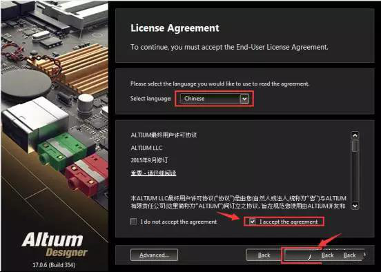 4.选择“Chinese”,再选择“l accept the agreement”,点击“Next”。