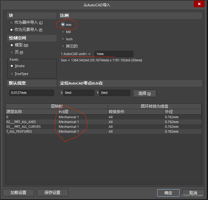 第三步,在弹出的窗口内选择比例单位为mm,1Auto unit = 1mm,下面映射层的PCB层选择Mechanical1,然后点击确定。
