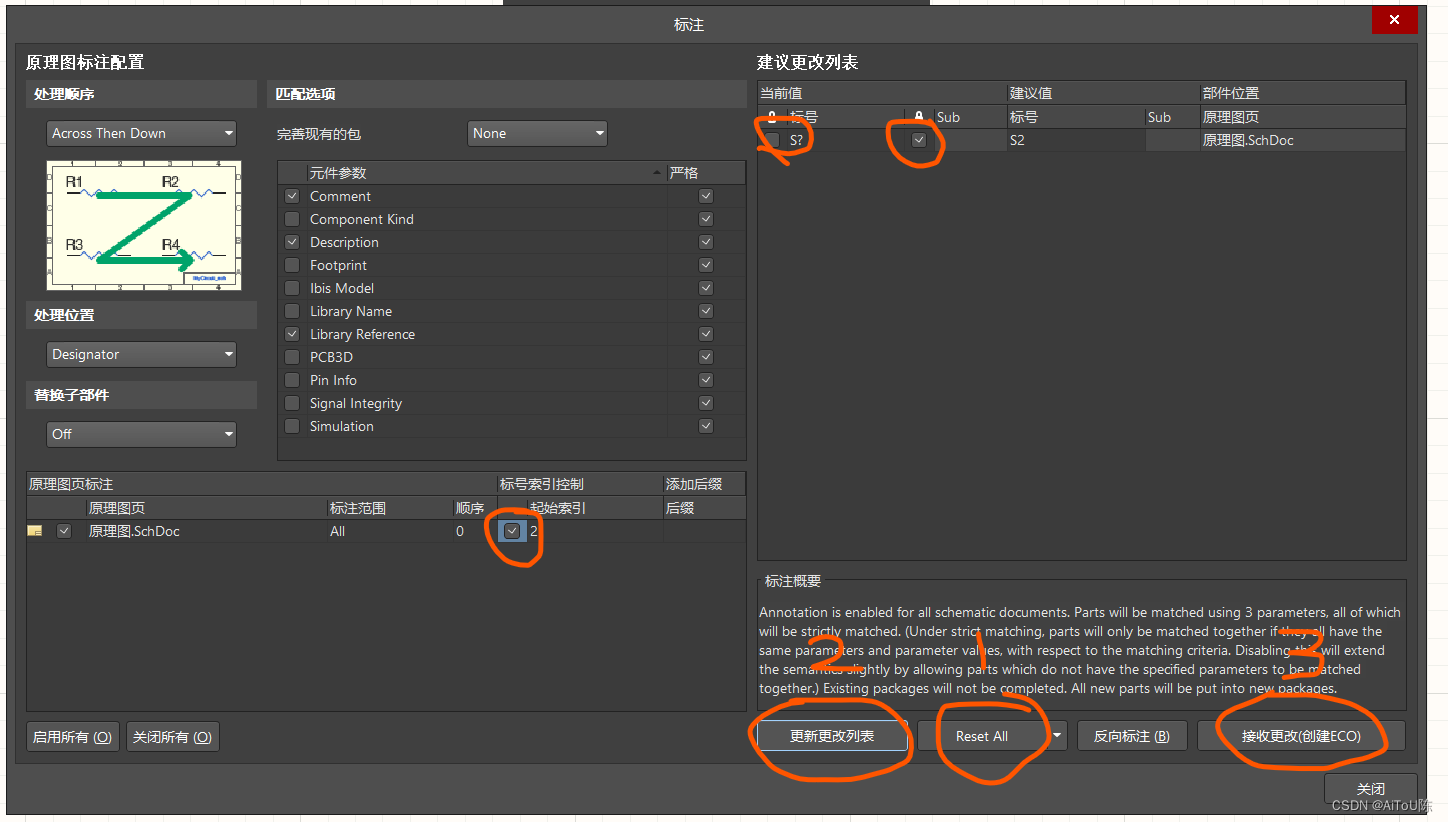 编号修改:工具 - 标注 - 原理图标注 - 按要求修改勾选选项 - Reset All - 更新更改列表 - 接受更改 - 执行变更。 左上角绿色部分是变更顺序。初始索引:编号开始值。 最后手动单独修改核对。(双击目标文字)