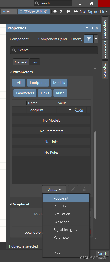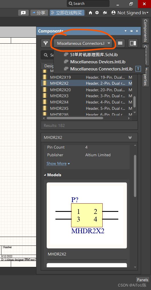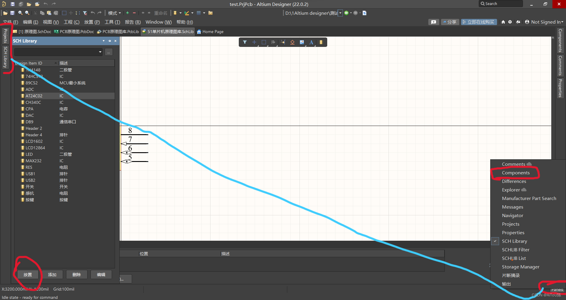 在原理图中调用原理图库中的原件有两个方法,一个是先进入原理图库的SCH Library的界面,选择 放置 后会自动跳转,另外值得一提的是,左侧有几个栏款却决于右下角Panels你有没有勾选(如图)。 在原理图中调用原理图库中的原件另一个方法,打开原理图 - Components(Panels中打开)- 右栏选择目标库 - 按左键拖动即可。
