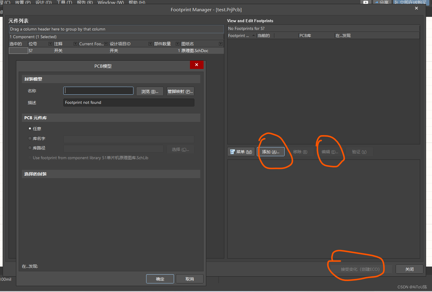 Footprint修改:工具 - 封装管理器 - 左侧栏选择目标(可多选) - 添加封装形式- 接受变化 - 执行更改。 也可以单独双击元器件,进行单独修改Footprint。