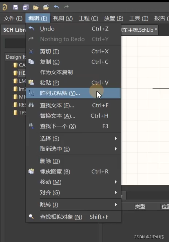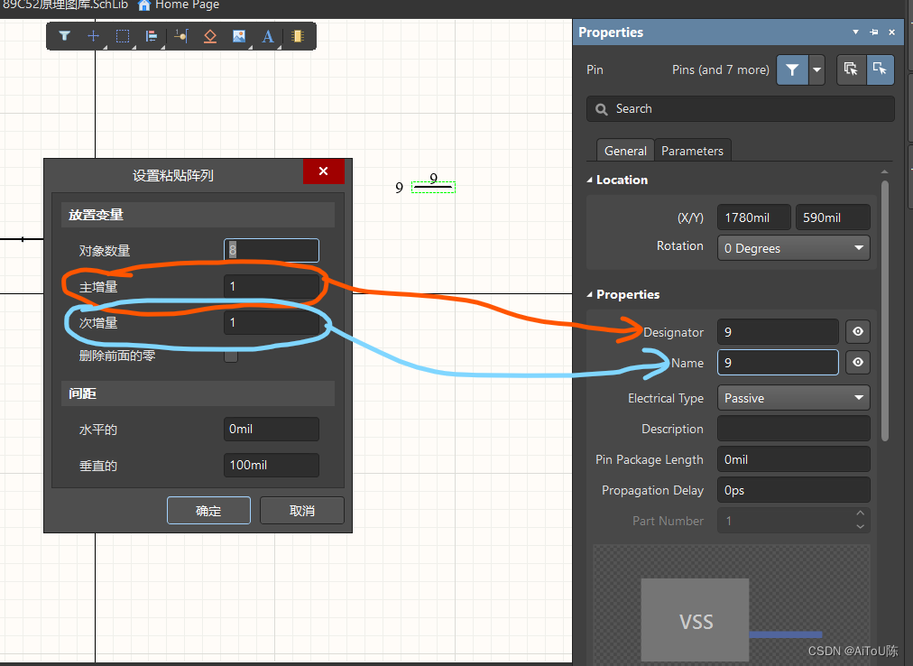 对于绘制中需要绘制很多管脚的时候,可以先绘制一个再进行快捷操作(选中管脚-Ctrl+c-再点击编辑-选择阵列式粘贴-设置要几个管脚,主增量,次增量) 主增量,次增量是用来设置每次增加的量,设置Designator和Name的每次增量(限数字) 想同时多选:要按住Ctrl后点击多个目标。用键盘移动目标:点击选中后按住Ctrl的同时按左右移键。