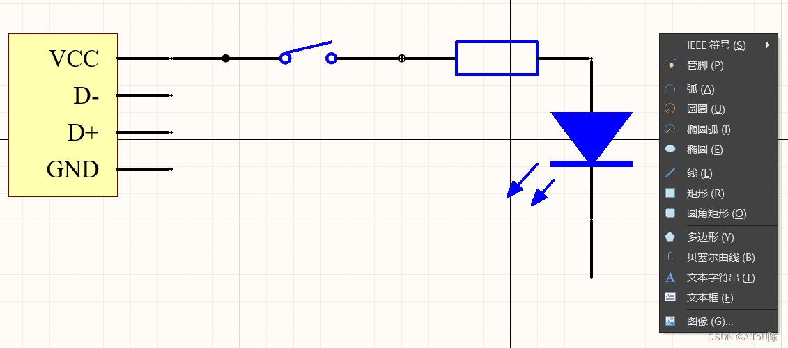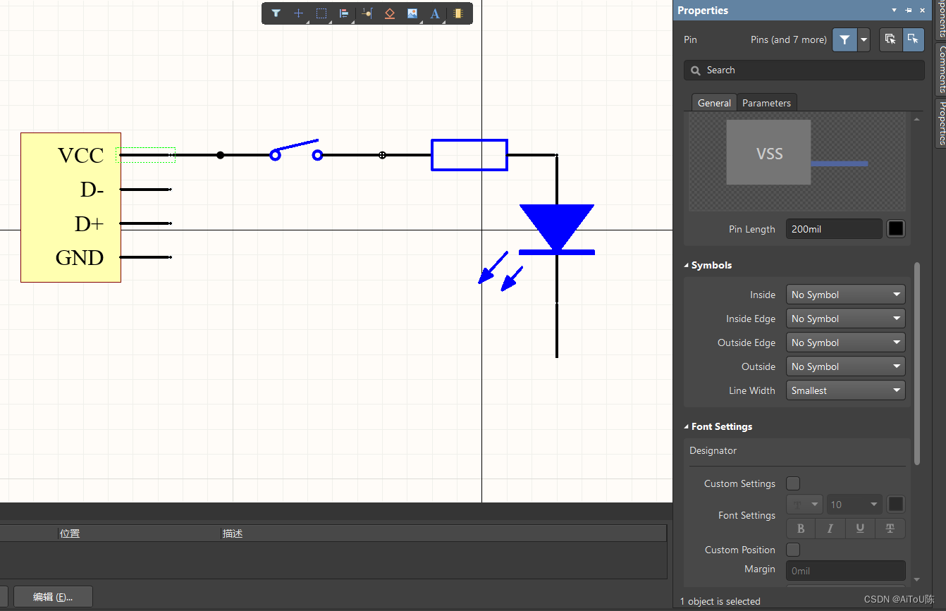 画二极管用多边形就够了,画完后还要想刚刚说的那样去按目标样式去右栏里面选择你要的样式,一个个尝试一下就知道了,选项不多,就几个。 画开关就用到圆圈,值得注意的是画这种细节的东西,需要把栅格调小一些。 图中你所看到的箭头,黑圆圈都是文章开头讲的,通过调管脚,线的样式弄出来的。 通过多次时间你就知道管脚号(Designator)和管脚名(Name)的区别是什么了。
