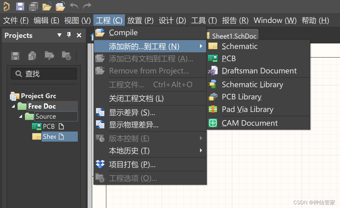 点击工程(Project)——>点击添加新的...到工程——>点击Schematic