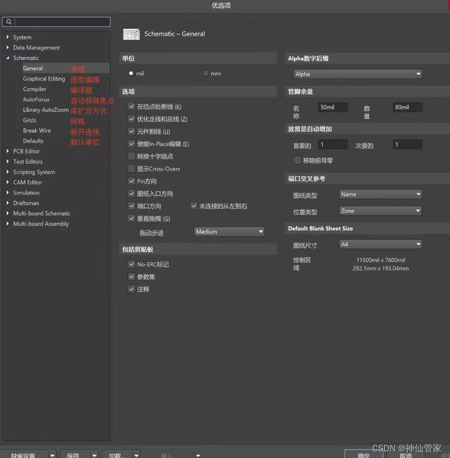 在AD软件中,原理图编辑器工作环境设置是通过原理图的“Preferences”(参数选项)对话框来完成的。