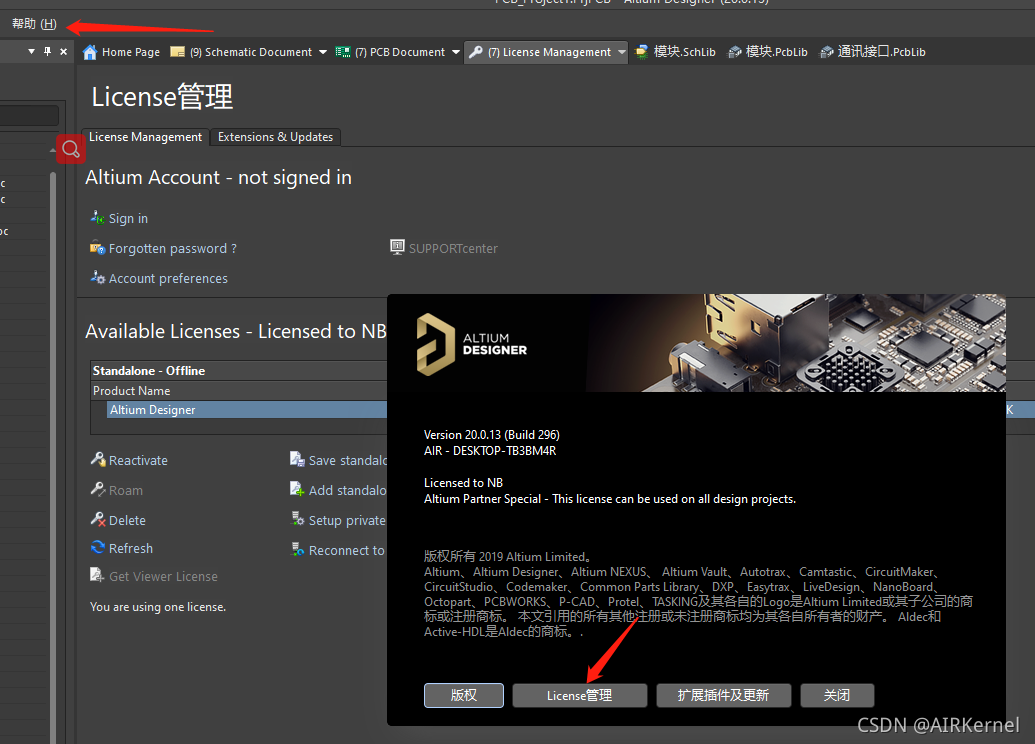 3、运行Altium Designer 20即可, 在AD20主界面的”License Manager“中选择【 Add standalone license file】导入破解包中”AD20和谐包/License“目录下的任意一个.alf文件即可,也可以点击主界面右上角的那个用户小图标打开”License Manager“窗口导入License。