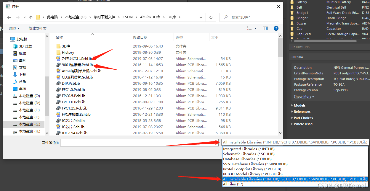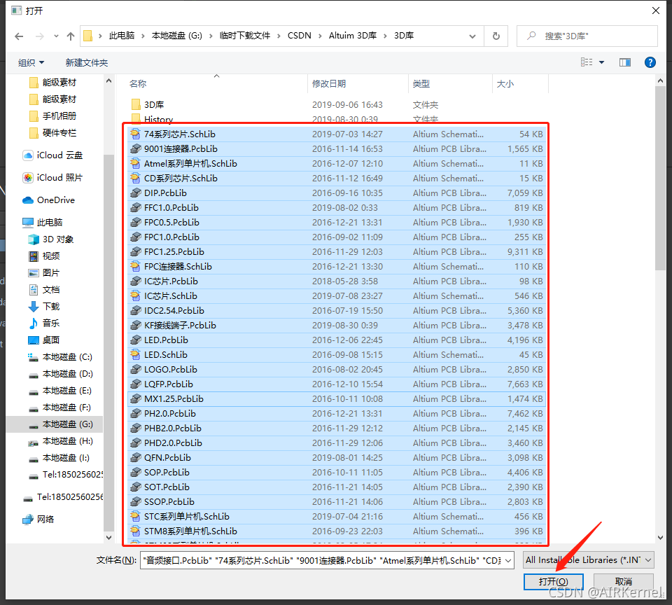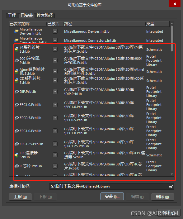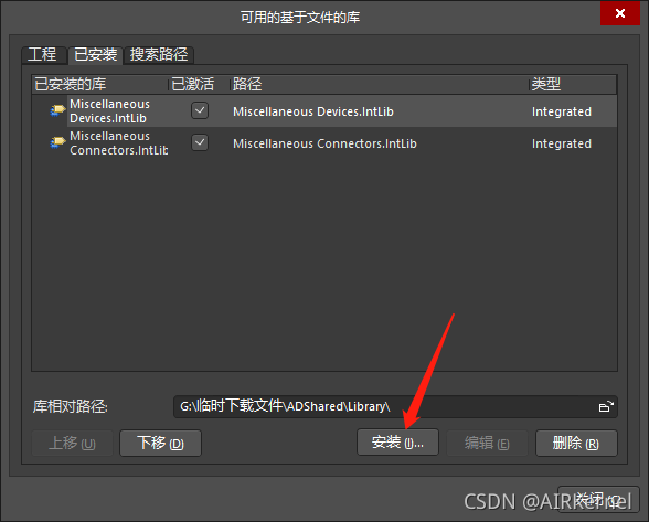 点击安装。然后选择要安装的 .SchLib(原理图库) 和 .PcbLib(PCB封装库) 文件