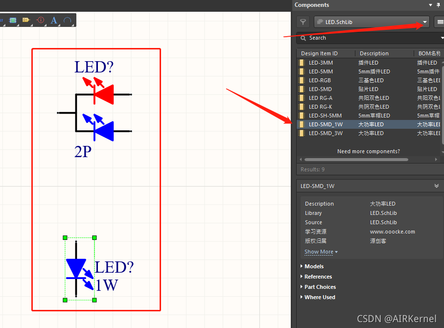 在右侧 Componens内选择合适的库,然后随便拖拽里面的元器件到原理图,表示封装已经安装完毕!